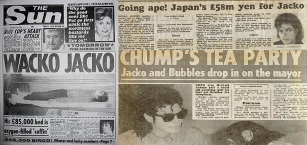 Commenting the presence of his chimpanzee Bubbles on his first solo tour in 1987, a tabloid titled „Chump’s tea party“. Hard not to see any reference to the Chimp’s tea parties organized by the London Zoo until the 1960s. From the first concert, the Bad tour was qualified by a tabloid as “the weirdest show on earth”; another one commented it “[was] going ape”, precising how much money Japan was spending “to see Jacko”. Michael Jackson’s rivalry with fellow artist Prince was described as a “gorilla warfare”, featuring the (very innocent) insertion of Bubbles between the two. When Michael Jackson sent an open letter urging the press to “walk two moons in his moccasins before judging him”, the British tabloid The Sun – the first one to use the nickname Wacko Jacko – purposely added spelling mistakes. Numerous press covers reduced him to some circus animal over the years: “Michael Jackson’s flying circus” (1987); “A day in the park with Jacko” (2003); “Daddy’s clowning” (2009). It’s his fault! He shouldn’t be that eccentric! came as a justification : after all, no one forced him to have a monkey as a pet, sleep in an oxygen chamber or retreat in some fantasy world! Michael Jackson may have had his own responsibility in his public perception to some degree, one should wonder to what extent the eccentricities of his fellow artists (Elvis Presley, David Bowie, Freddie Mercury, Elton John, etc…) were submitted to the same kind of media treatment. Whatever the circumstances behind the oxygene chamber story were, could Michael Jackson have known that this famous photo of him would be the starting point of multiple fake news feeding the “Wacko Jacko” narrative over three decades?